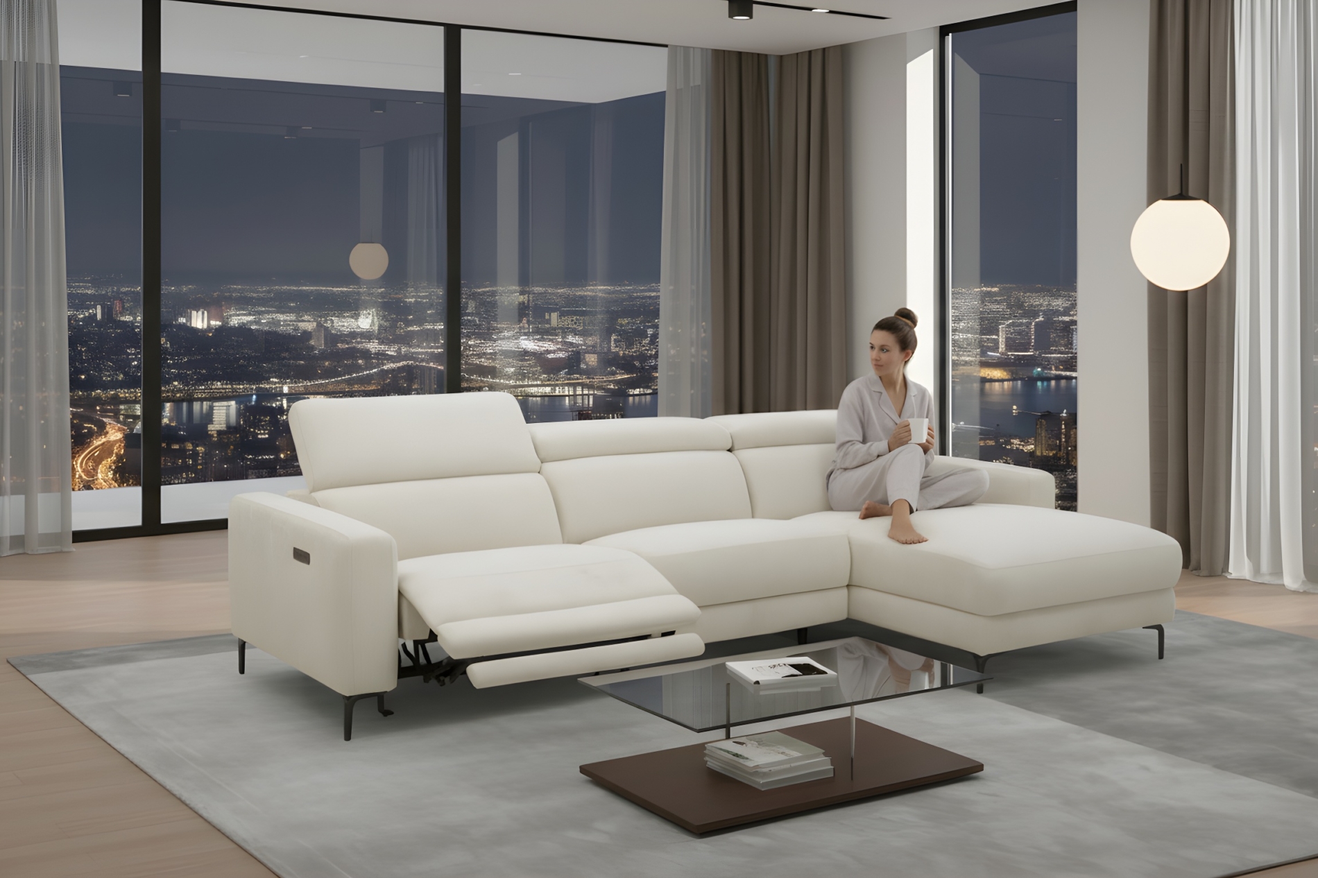 Son design sur pieds fins apporte légèreté et facilite l’entretien. Il intègre une relaxation électrique pour un confort optimal, ainsi que des appuie-têtes réglables pour un soutien personnalisé.